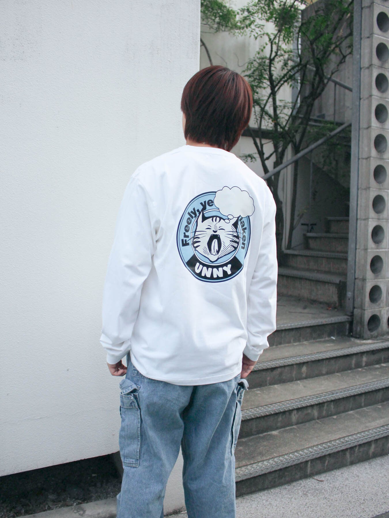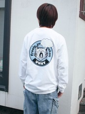 バックにグラフィックデザインをプリントしたロングスリーブTシャツ。