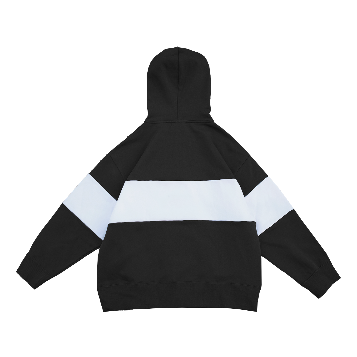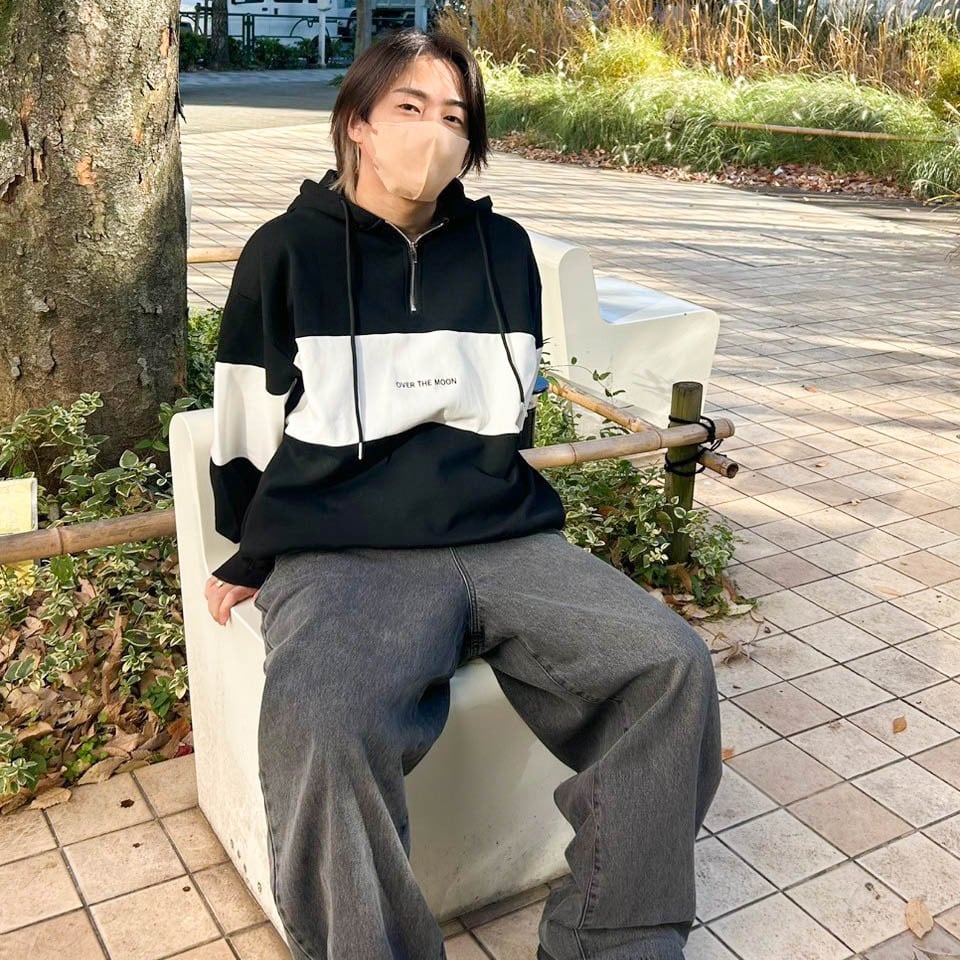 フロントと袖部分の配色が特徴的なハーフジップパーカー。